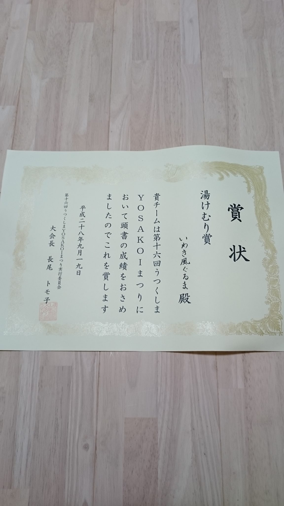 以下の賞を受賞しました。(雨による湿気でふにゃふにゃ・・・すまぬ、賞状よ)